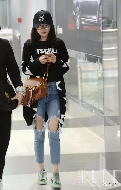 又是一条炸开得牛仔裤,杨幂这条的破洞开在膝盖上方,破洞大小不算夸张,搭配黑色的星星外套,脚踩绿色板鞋。