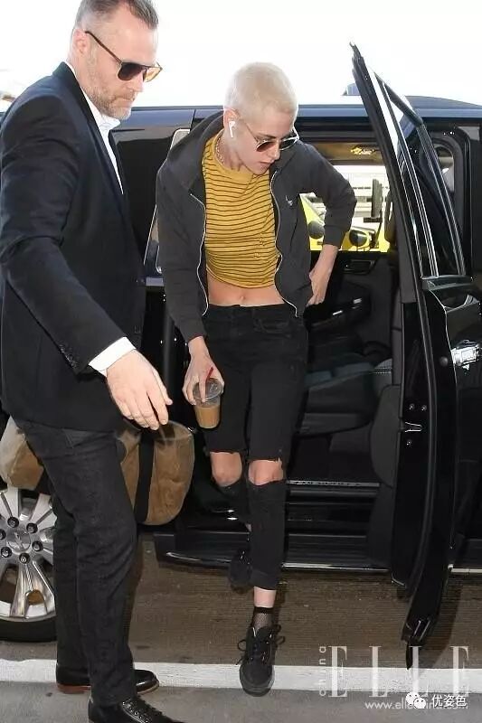 差点没认出来这是克莉丝汀.斯图尔特,这一头金色的板寸也是没谁了!当然也不能错过黑色破洞裤啦,搭配条纹黄的上衣和运动外套,随随便便就把你帅倒。