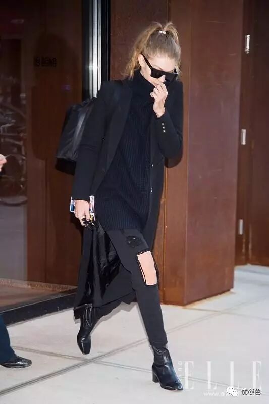 Gigi Hadid出街这一身黑,那这条破洞就是她的亮点里,有颜值和大长腿,当然怎么穿都时髦啦!
