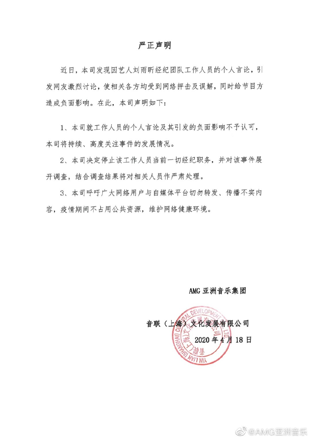 目前刘雨昕所属公司AMG音联已经发表声明撤职涉事经纪人,并对此事进行调查。第一轮排名后,刘雨昕和孔雪儿就在出道位边缘徘徊,分列八、九位。在二轮投票的关键时期突然出现了这样的事儿并大规模发酵,很有可能是有团队想一下子搞垮两个人,好让排在后面的选手成功上位。