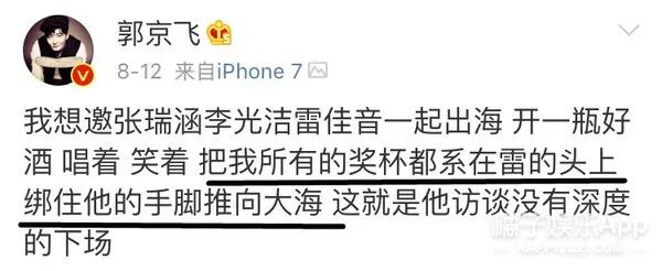 访谈是8月12号上线的,郭京飞这一天已经气到要绑住雷佳音的手脚,把他扔到大海里▼