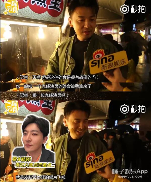 金马奖后和记者一起逛台北夜市,他穿着郭京飞的外套,还不忘diss人家是“一个皮肤不太好的九线演员”。
