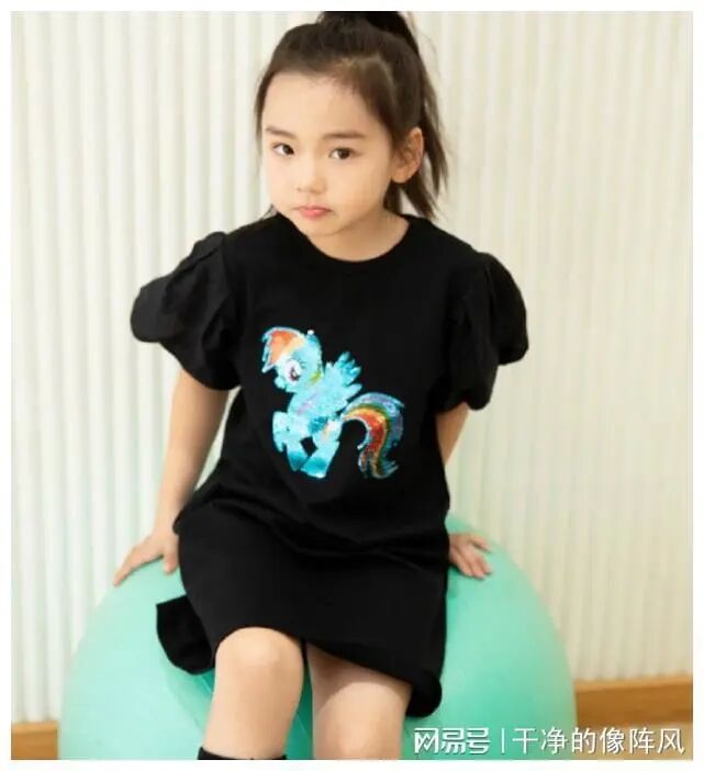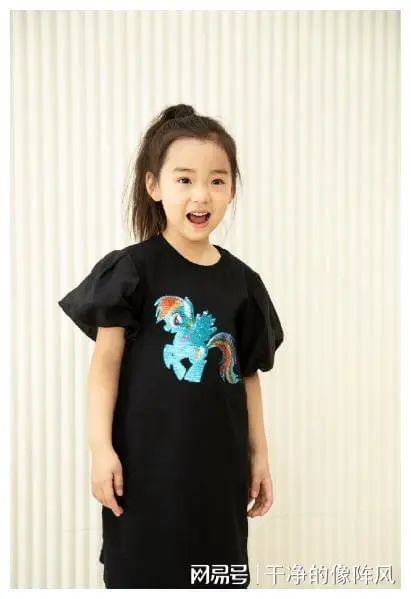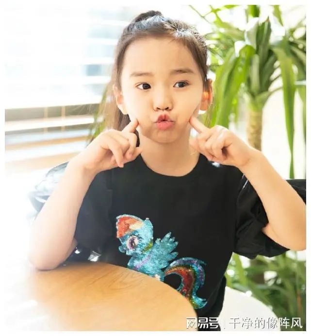 在曝光的大片中,小酒窝头扎着高高的马尾辫,穿着黑色独角兽图案设计的长裙,两只手轻轻戳着脸颊两侧的酒涡,没有忘记嬉戏地嘟着嘴装可爱,可爱可爱的外观瞬间更新了相对高度。