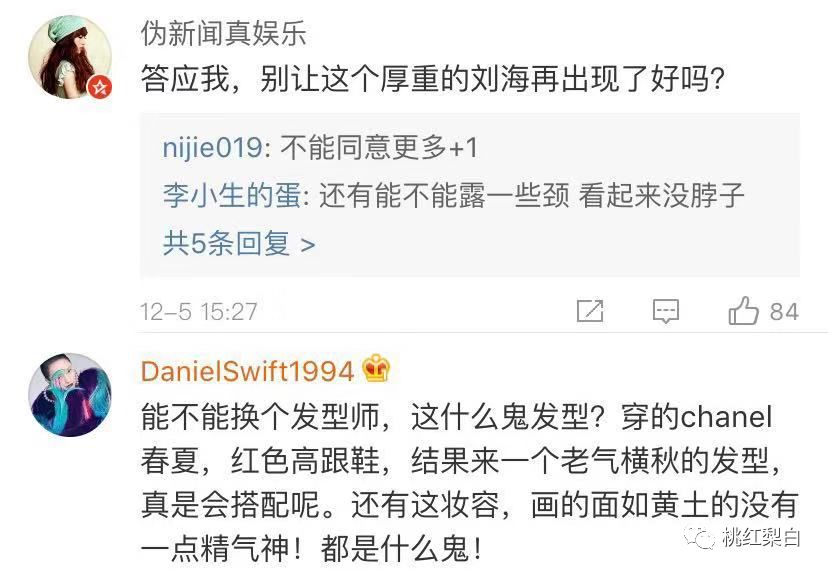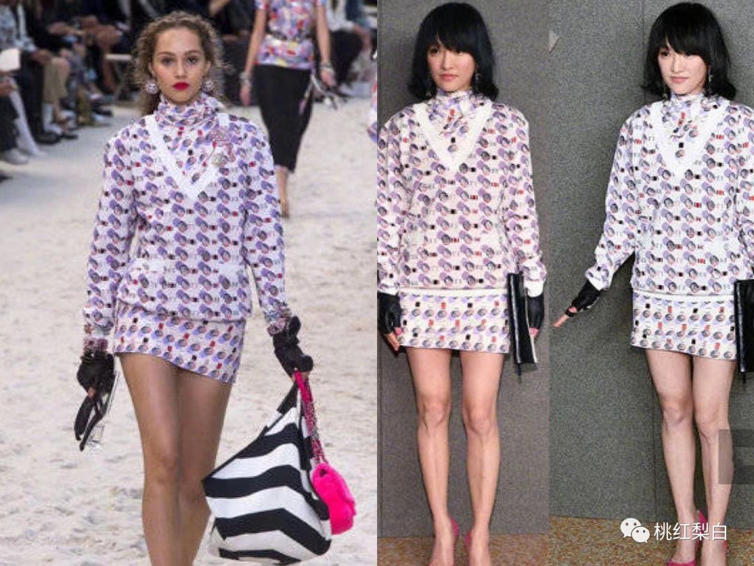 但这一身看秀装,真的不太美丽。虽然短套装露出了美腿优势,但是过紧的高领真的显得周迅头很大……过于厚重的齐刘海发型也不太适合她,把本来灵气十足的一双眼给遮了个严严实实,评论各种喊话换造型师。