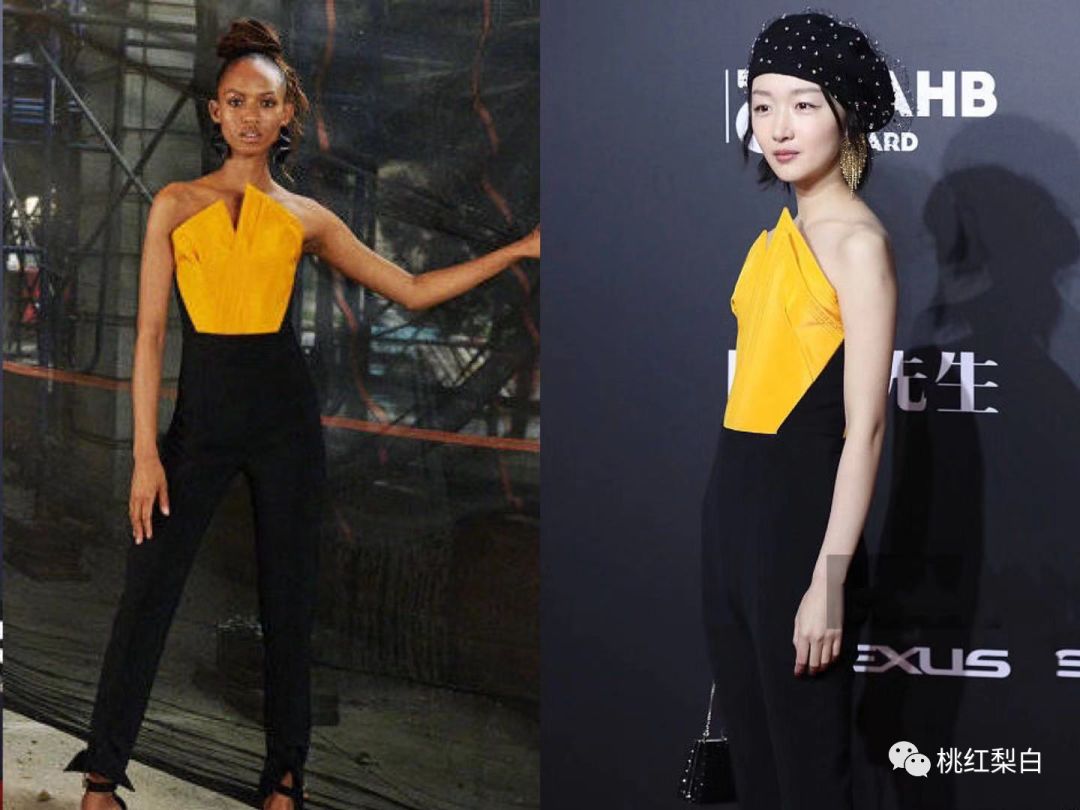 这身黄色抹胸配黑色长裤的穿搭,总觉得有些怪异,尤其这个立体的黄色抹胸,乍一看真的很有餐桌布的即视感。