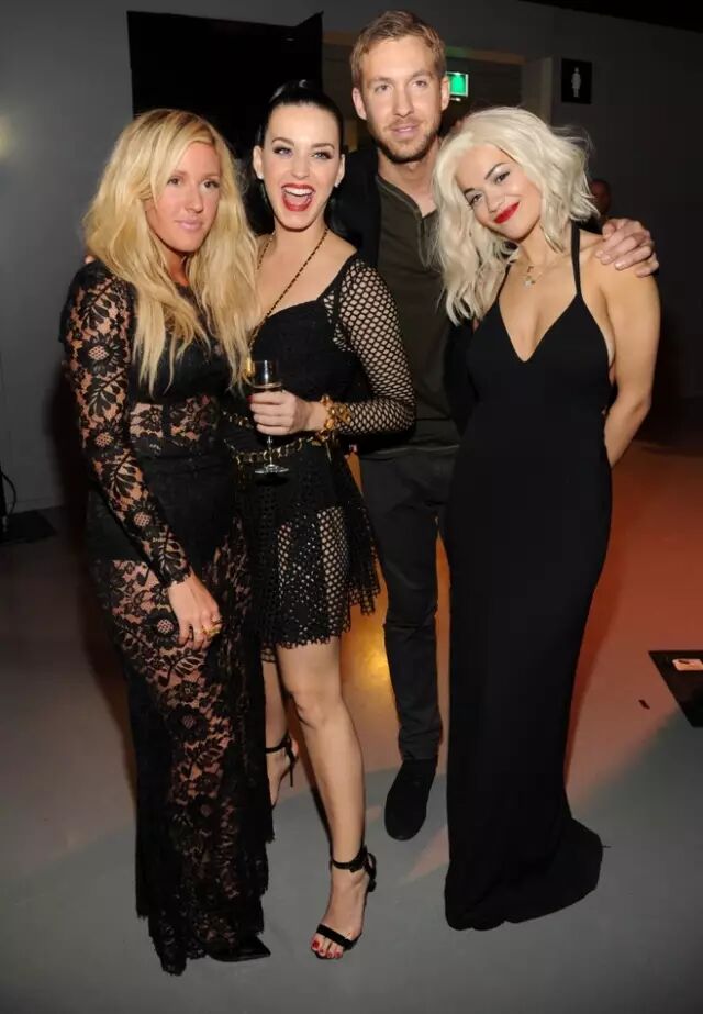 2013年MTV颁奖礼上,卡受同自己这辈子几个比较重要的女人的合影。绯闻女友Ellie Goulding(左一)、合作演出临场被卡受放鸽子的Katy Perry(左二)、前前前女友Rita Ora(右一)