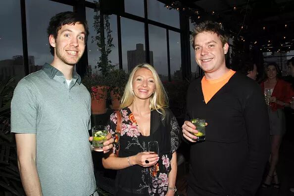 Calvin Harris同自己的伯乐Mark Gillespie(右一), Lucy Collen(中)在由MULBERRY和VOGUE举办的鸡尾酒派对上的合影