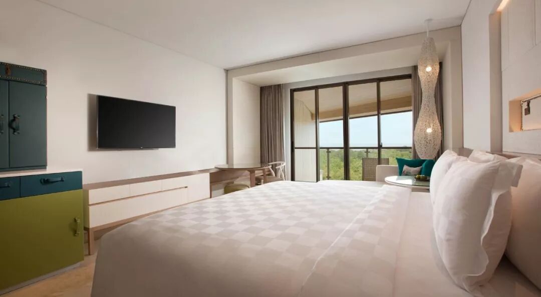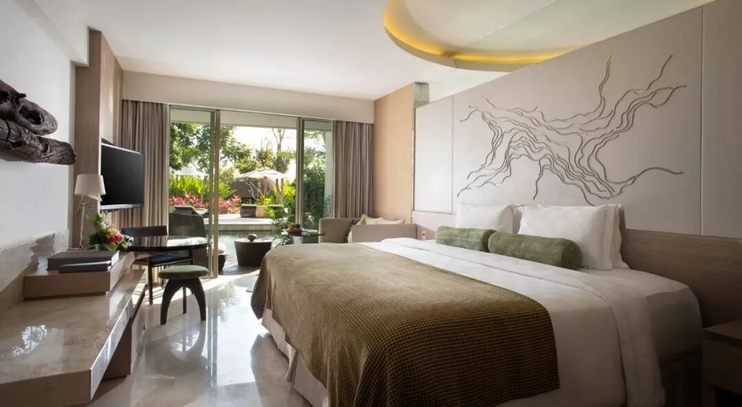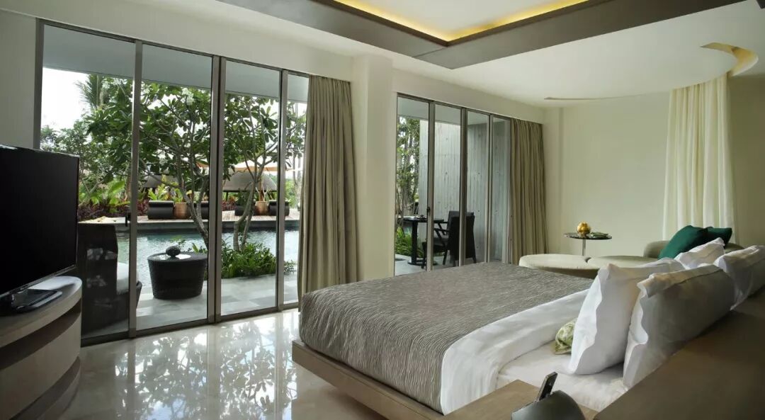 38平方米的泳池连通房设计精致,位于热带园景底层平台,与半私人环礁湖式泳池直接连通,乐趣非凡。泳池连通套房坐拥热带庭院美景并与半私密泳池直接相连。于此享受清凉夏日时光。
