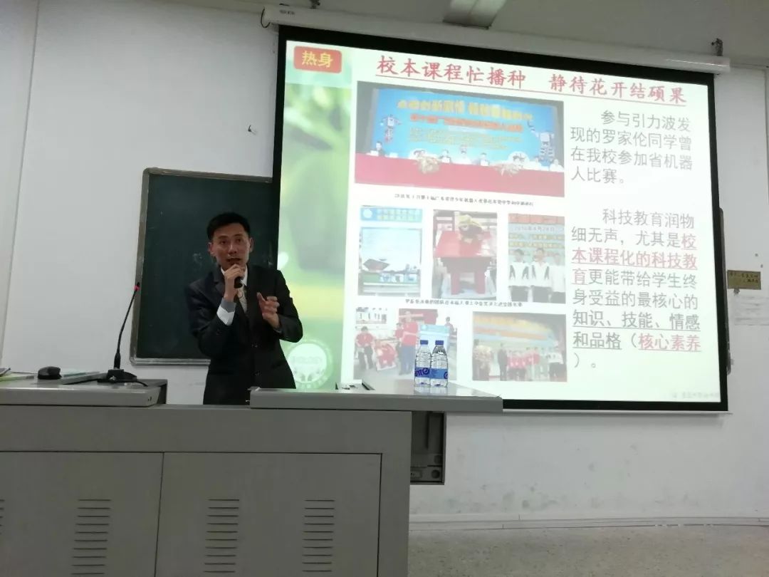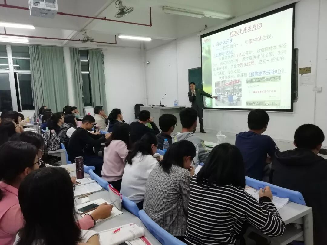 报告包括两方面的内容:1.青少年生物科技活动的设计与实施;2. 初中生物校本课程创新设计与实施。肖老师结合自己多年来的中学生物教学与指导中学生开展生物科技活动及生物校本课程开发的实践与成果,形象生动地阐明如何进行青少年生物科技活动的设计与实施,如何进行生物校本课程的创新设计与实施,如何将青少年生物科技创新、生物校本课程开发与发展中学生的四大“核心素养”有机结合,肖老师强调作为老师要坚定“播下种子,静待花期;花期已至,硕果累累”的信念,要“授人以鱼不如授人以渔”。在讲座中,肖老师提到,指导学生进行科技活动不能照本宣科,要注重创意和创新;要鼓励有想法的学生们大胆尝试、勇于付诸行动。肖老师同时分享了“东莞市青少年(生物学)实验技能大赛”的发展历程与成果,以及“活动课程化,课程活动化”等一系列教学理念。肖老师以“教育是提供学生离开学校以后不会忘记的素养”作为本次讲座的结束语与在座的师生共勉。肖老师的讲座内容丰富、妙趣横生,有理论有实践,让全场师生感受到了一名中学名师的无限魅力、满满情怀及撸起袖子干的精气神。精彩的报告赢得在场全体师生的阵阵掌声和高度评价。