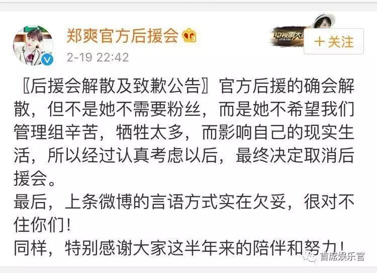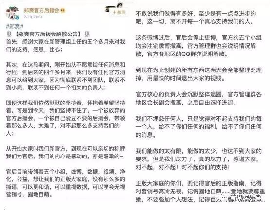 昨晚,郑爽官方后援会在微博发布了一则“郑爽官方后援会解散公告”,称该后援会即将解散,之后官后会停止更博,后援会的成员、官方管理群、QQ群等也会陆续解散。