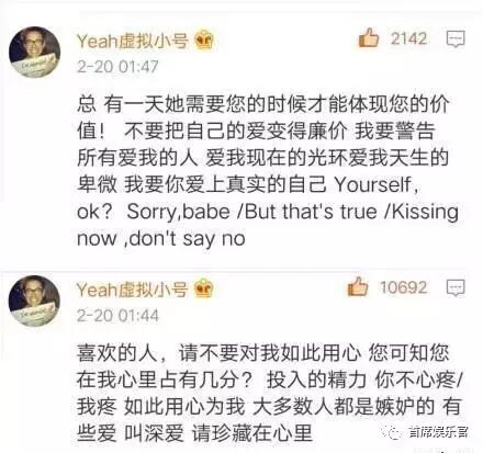 之后,疑似郑爽的微博小号“Yeah虚拟小号”发布了以下两则评论作为回应。
