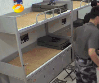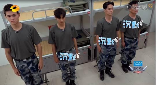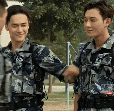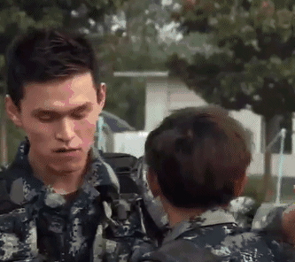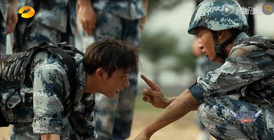 做完俯卧撑入列的时候,因为两人速度不够快,重复做了好几次。一个不小心,两个人撞在一起,wuli韬韬不堪一击,向观众展示了互怼是一件痛并快乐着的事情,连班长看到了都在憋笑。