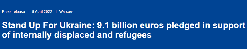 The “Stand Up for Ukraine” global pledging event and campaign has raised 9.1 billion euros for people fleeing the Russian invasion, inside Ukraine and abroad, including €1 billion from the European Commission. On top of that, the European Bank for Reconstruction and Development has announced an additional €1 billion in loan to cover the needs of the people displaced by the invasion.
