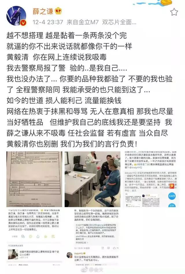 前夫黄毅清最近也没有闲下来,连发多条微博爆料薛之谦吸毒,无奈之下薛之谦只好亲自去警局验毒证明清白。