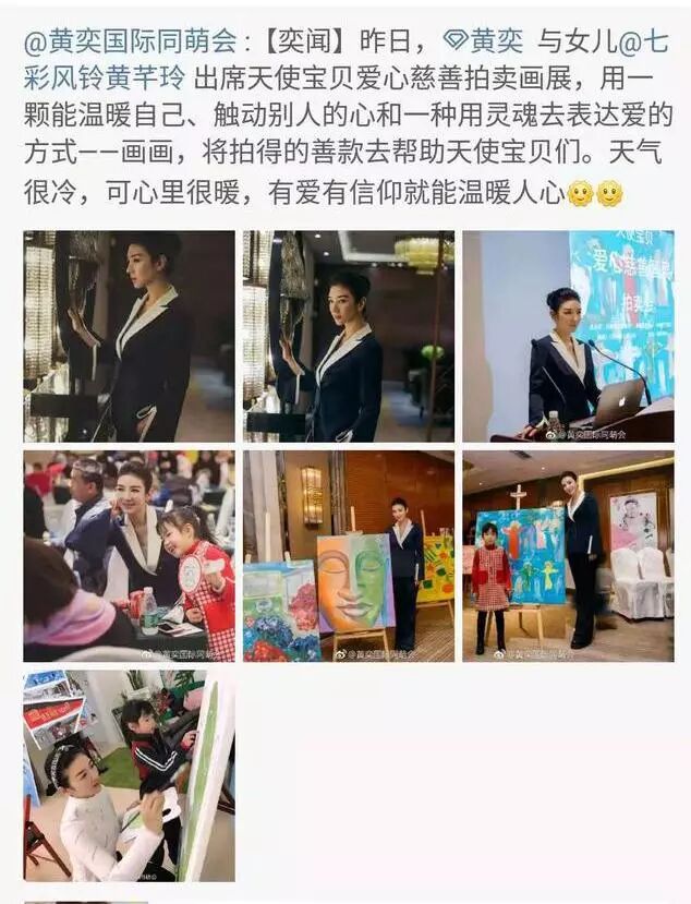 12月8日,黄奕与女儿一同出席天使宝贝爱心慈善拍卖画展,小朋友们的画拍卖所得款将会全数捐给天使宝贝基金,用于救助意外烧伤的小天使们。