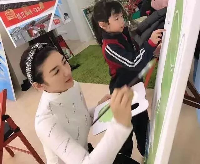 黄奕和女儿一起画画,看得出两人很亲密配合也十分的默契。黄奕戴着简单的格子头箍,手上拿着颜料和画笔,看起来十分专业。女儿黄芊玲乖巧地陪伴在左右。