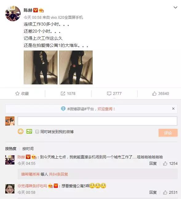 陈赫还回忆了以前工作的时候,“记得上次工作这么久,还是在拍爱情公寓1的大堵车”。一语既出,引发网友纷纷感慨。