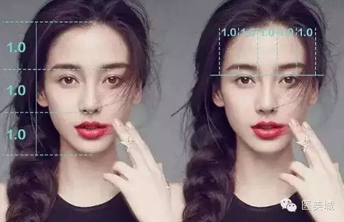 五眼:是指将面部正面纵向分为五等分,以一个眼长为一等分,即两眼之间距离为一个眼的距离,从外眼角垂线至外耳孔垂线之间为一个眼的距离,整个面部正面纵向分为五个眼之距离。