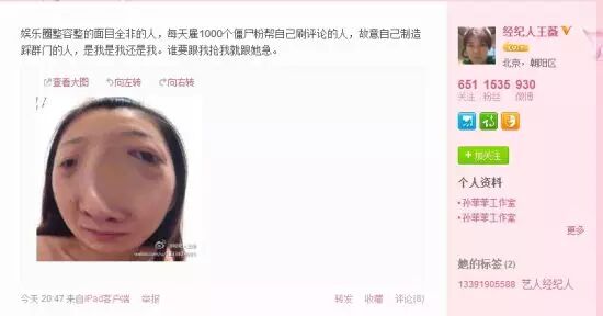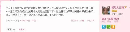 以及更早之前的孙菲菲前经纪人王薇在微博上爆料孙菲菲整容以及制造踩裙门事件,还说孙菲菲每天顾1000个僵尸粉刷评论。后又发微博说孙菲菲威胁她,并要将她一纸上诉告上法庭,还说如果我今后要是真的出什么意外那就是孙菲菲害的。