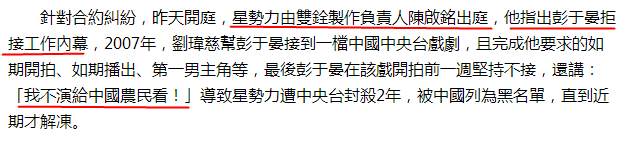 彭于晏就因为未处理好与前经纪公司的解约问题,解约时被前经纪人爆料彭于晏辞演《香港姊妹》时说:我不拍给中国农民看!