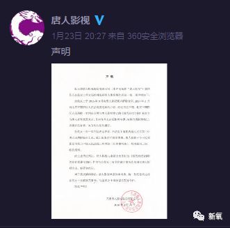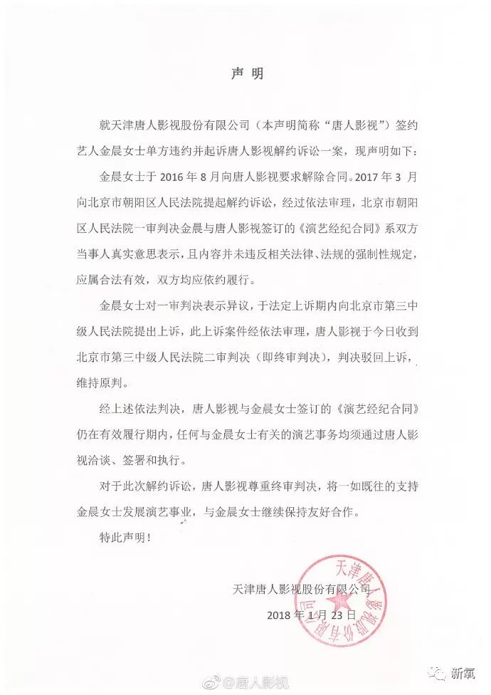 昨天下午,唐人影视突然发声明:金晨诉唐人影视解约案二审再次败诉。