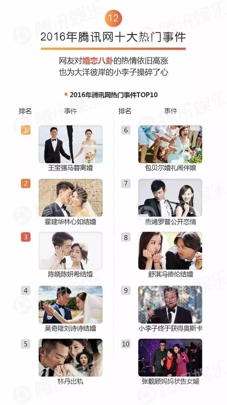 这一年啊,身为一只单身狗的你一定被无数婚礼、恋情、秀恩爱虐得不要不要的,“霍心”大婚、“双陈”大婚、“隆诗”大婚和舒淇冯德伦结婚占据了热门十强中的四席,算上包贝尔伴郎闹伴娘、张靓颖妈妈闹女儿这俩非典型婚礼事件、以及唐嫣罗晋公开恋情还没结婚这对,婚恋这个ACE选手在榜单上处于绝对优势。