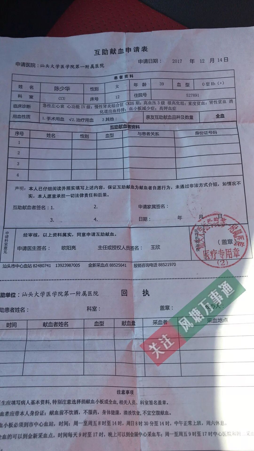 本人亲姐姐:陈少华是潮州潮安凤塘人!可怜!才40岁!希望献血人士伸出援手!声明:什么血型都可以!谢谢!患者现人在汕头大学医学院第一附属医院:科室CCU.临床诊断..1.急性左心衰;2.慢性肾衰竭;3.严重贫血;4.血小板减少;5.尿毒症。