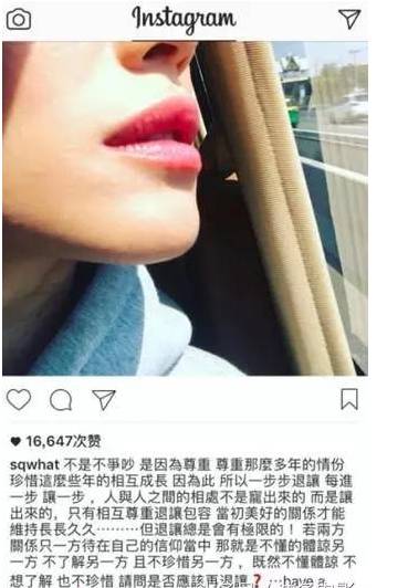 舒淇:“不是不争吵 是因为尊重 尊重那么多年的情份 珍惜这么些年的相互成长 因为此 所以一步步退让 每进一步让一步,人与人之间的相处不是宠出来的 而是让出来的,只有相互尊重退让包容 当初美好的关系才能维持长长久久但退让总是会有极限的!若两方关系只一方待在自己的信仰当中 那就是不懂的体谅另一方 不了解另一方 且不珍惜另一方,既然不懂体谅 不想了解 也不珍惜 请问是否应该再退让?have a great day。”