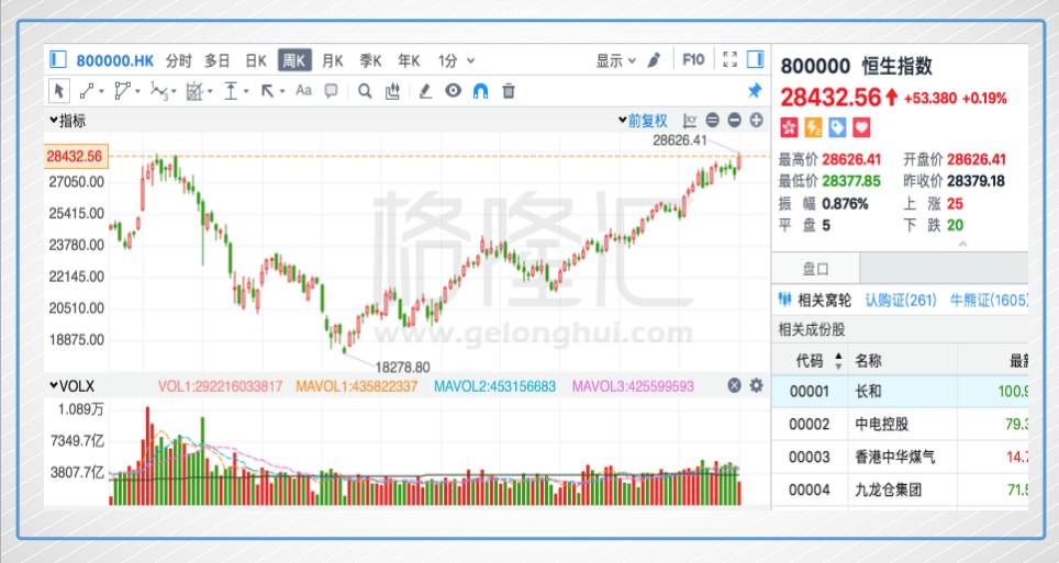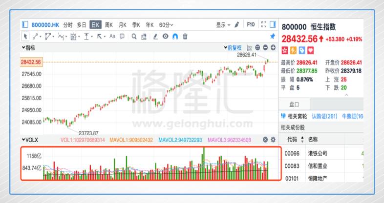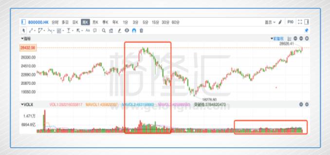 而从2015年开始的港股牛市,直到现在创出新高。恒指的成交量并没有显着放大: