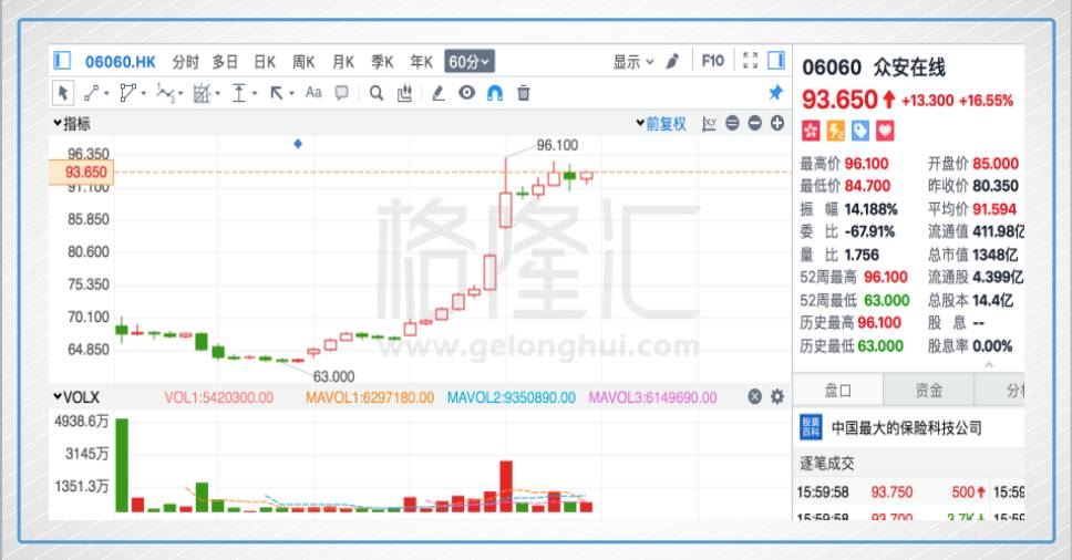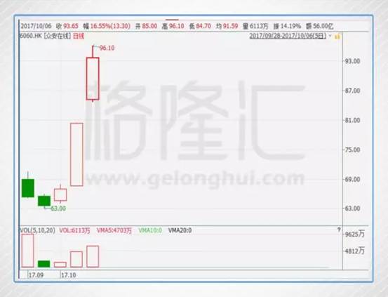 于9月28日以59.7港元上市的首家互联网保险公司众安在线(06060.HK),周五的收盘价格为93.65港元,上市至今的短短5个交易日内,该股累计上涨了56.8%。
