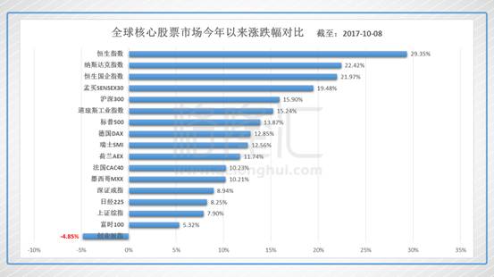 恒生指数2017年前9个月共上涨了29.35%,恒生国企指数上涨21.97%,牛冠全球: