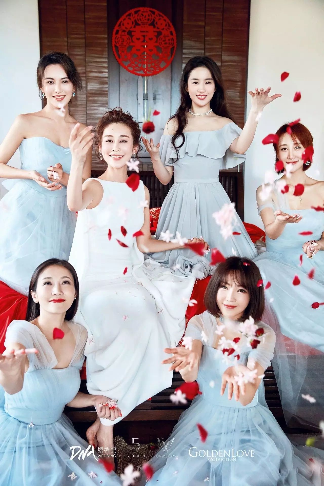 据悉,刘亦菲是周扬的大学室友兼多年闺蜜,是娱乐圈少有的低调姐妹花。照片中,刘亦菲、莫小棋等五位伴娘身穿浅灰色的伴娘裙,手捧花束。