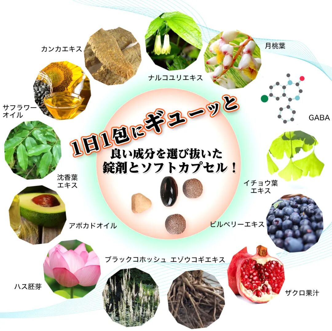 沉香叶,莲胚芽,月桃叶,鳄梨油,黑升麻,GABA,石榴汁,肉苁蓉,黄柴胡,刺五加等。