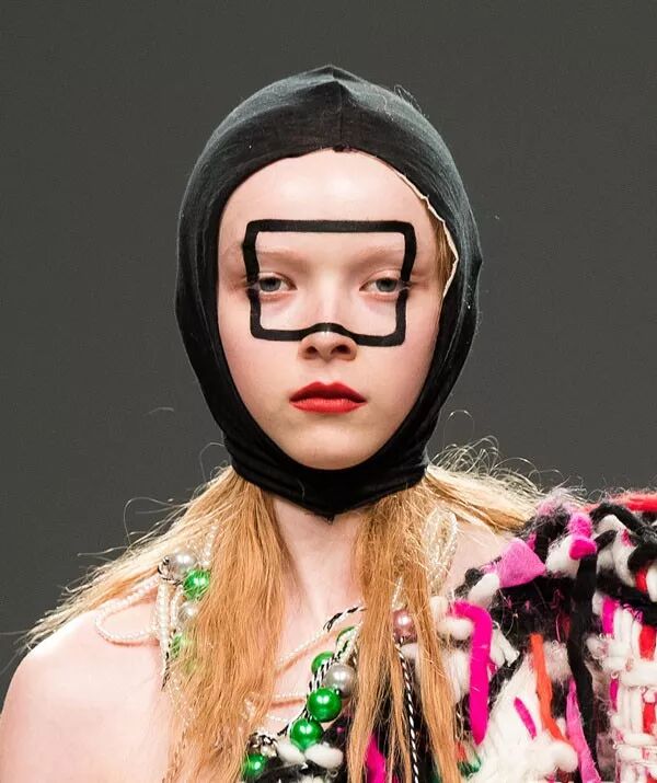 同样作为化妆艺术家的Matty Bovan,不难看出也是以夸张大胆的风格为主的。 在此次的伦敦时装展上,在显眼夺目的长方体横空出现在模特的脸上,镂空的长方体犹如在模特的脸上带上潜艇眼镜,遨游在时尚的时空里