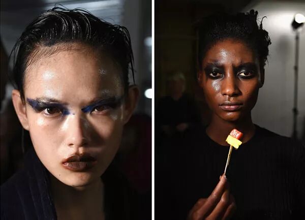 在妆容方面,同样也过犹不及的体现,强调光泽感的底妆,不油腻却有种流汗过后的湿漉感,湿发的造型得相得益彰。眼妆不及拘泥于精致的手法,泼墨般的画法有意识的歪曲眼妆的意义,带来艺术的体验