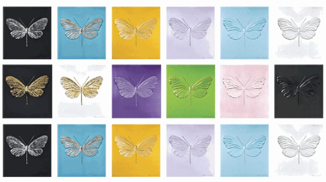 ▲英国艺术家Damien Hirst和莱俪是破天荒的共同合作,透过仿水晶将时间凝固,不但捕捉了蝴蝶的神秘美态,也捕捉了它背后代表的一切。永恒(Eternal)仿水晶版画系列,分别为美丽(Beauty)、爱(Love)、希望(Hope)。