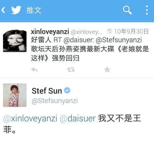 粉丝开玩笑说孙燕姿携新专辑《老娘就是这样》回归~孙燕姿回复:我又不是王菲。