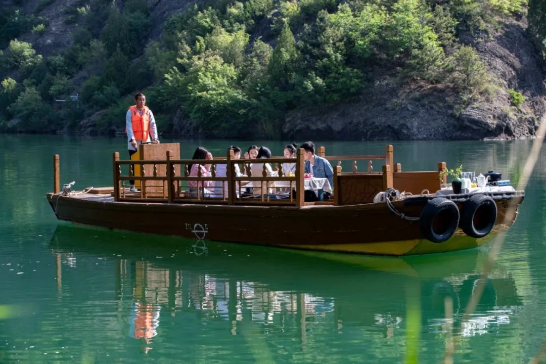 在缓缓前行的游船上,欣赏绿树和楼台,眺望蜿蜒曲折的长城,感受古北水镇的诗情画意。