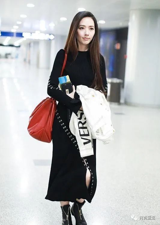 而且还在修身毛衣之下搭配着阔气版型的黑色休闲裤装以及皮质马丁靴,整身黑色不过带有着金色花边设计看起来更像是清新感的了,不过在裤子之上并没有搭配的那么的好了的。