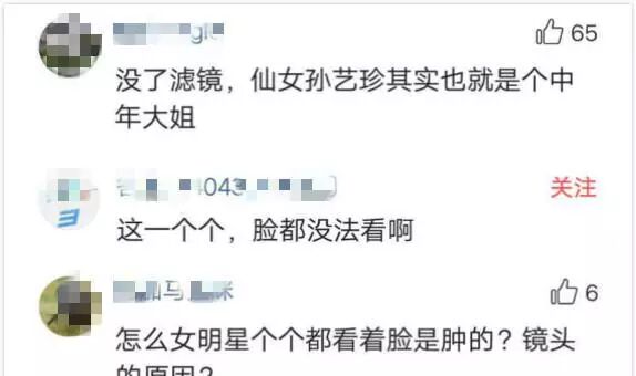 有不少网友吐槽:“怎么女明星个个都看着脸是肿的?镜头的原因?”"很多脸开始变相塌方了。”“没了滤镜,仙女孙艺珍其实也就是个中年大姐。”