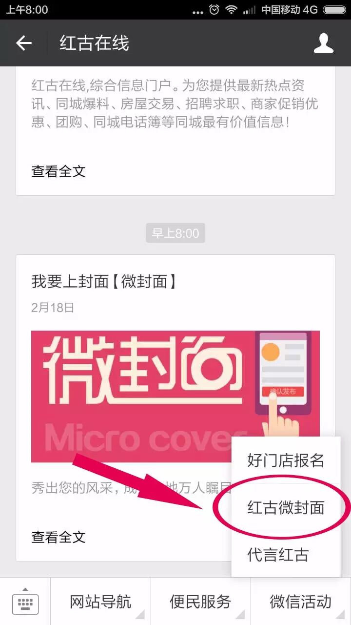 1.打开红古在线的微信界面,直接在菜单中选择“微信活动”→“红古微封面”可直接报名