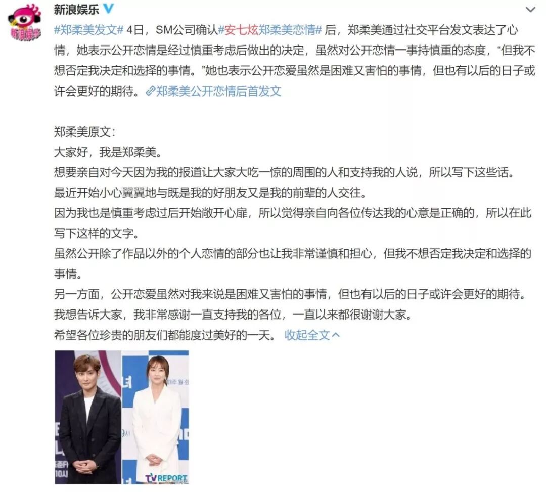 SM证实两人的恋情以后,郑柔美本人也发长文回应了这段恋情。