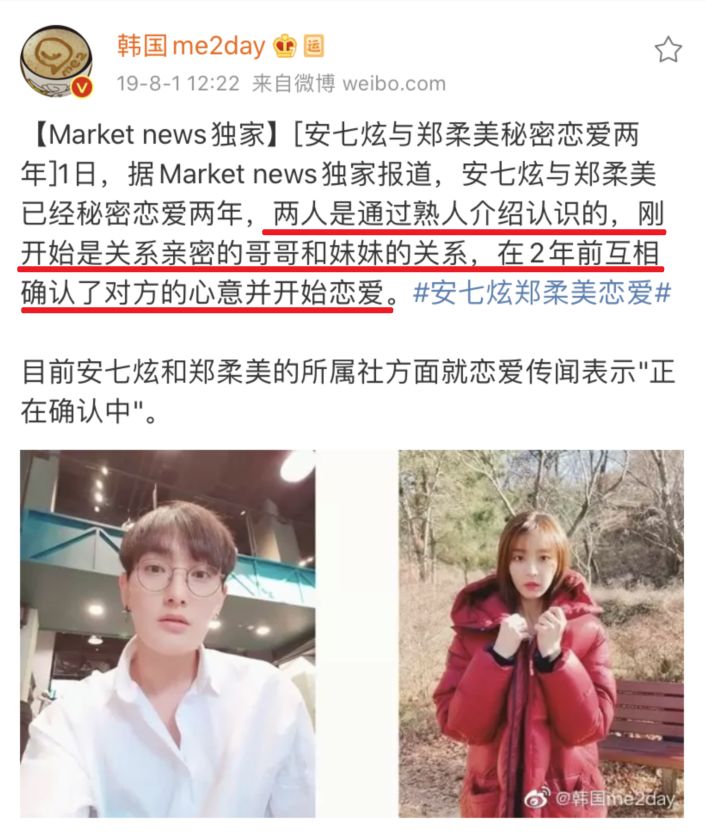 2020年2月,M社又曝光了郑柔美和安七炫的恋情,两人承认恋情声称是近期才开始交往的。