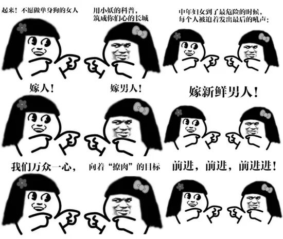 起来!不愿做单身狗的女人,用小妖的科普,筑成你们心的长城,中年妇女到了最危险的时候,每个人被迫着发出最后的吼声: 嫁人!嫁男人!嫁新鲜男人!我们万众一心,向着“撩肉”的目标,前进,前进,前进进!