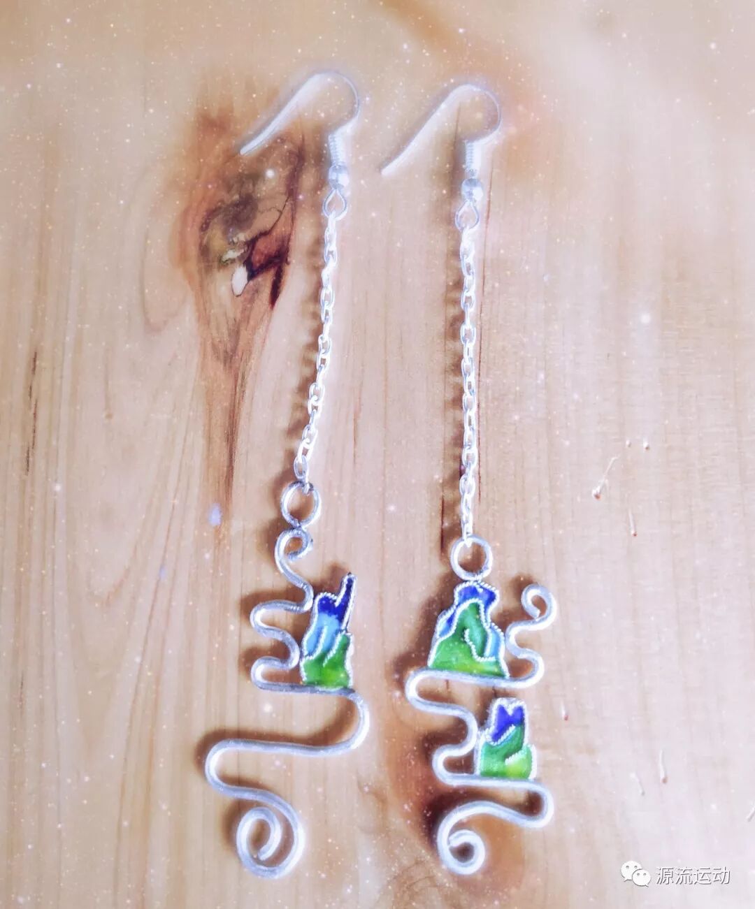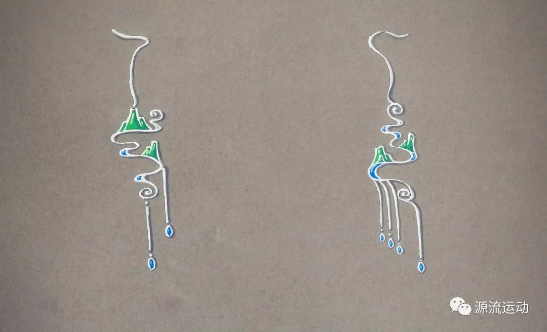 宋朝的书画为一绝,而王希孟的《千里江山图》更是其中最为壮丽之一。该作品是以《千里江山图》为设计主体,再设计出的一对耳饰。取江山为名,通过缩小与简化,把宋朝的江山带在身边。同时也加入了些许现代元素,方便年轻人接受,造型古风,容易受到喜爱汉服等传统文化的年轻人追捧。作品采用了偏向古风的风格,以银料表达山水。通过珐琅彩与银丝来表现山川的壮丽与颜色以及江河的湍流不息,而连接耳钩的锁链代表了水流的急促以及山川间的瀑布。