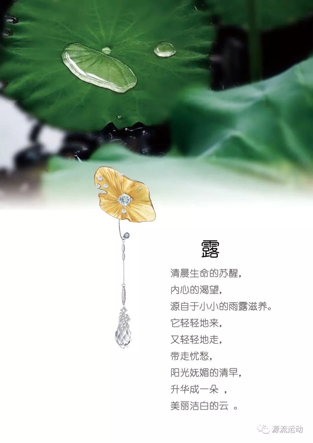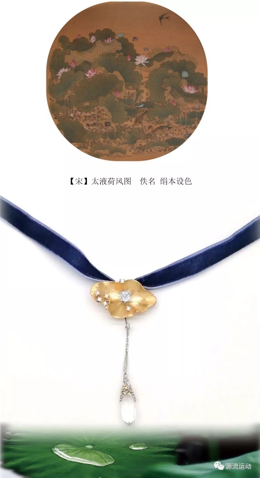 作品《露》灵感素材取自台北故宫博物院藏宋画《太液荷风图》,作者以太液池内的莲花为题,表现了池内碧叶连天,莲花掩映的景色,这件饰品表现了动感之美,荷叶上微微颤动的晨露,在阳光的照耀下,晶莹剔透,不娇不娆,如少女般娇羞,露水滴落,激起一片涟漪,这自然界生命的动态形式,让人充满欣喜与联想。
