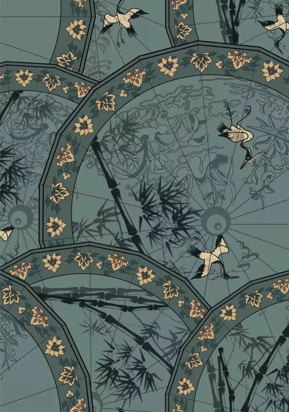 整体运用油纸伞的造型打造优雅的古风。“挑纱荷花满池娇背心儿”。局部图案将鹭鸶佇立,一鹭鸶飞翔,鹭鸶旁衬以水波、荷叶以及野菊、水草、云朵等进行围绕,丰富又古典。