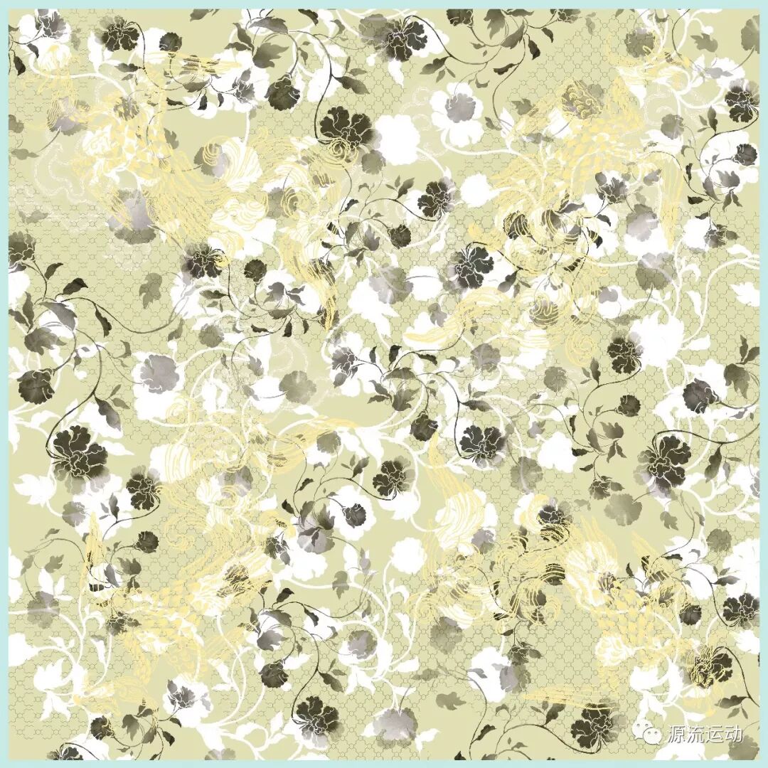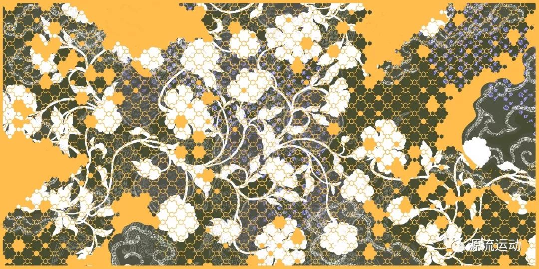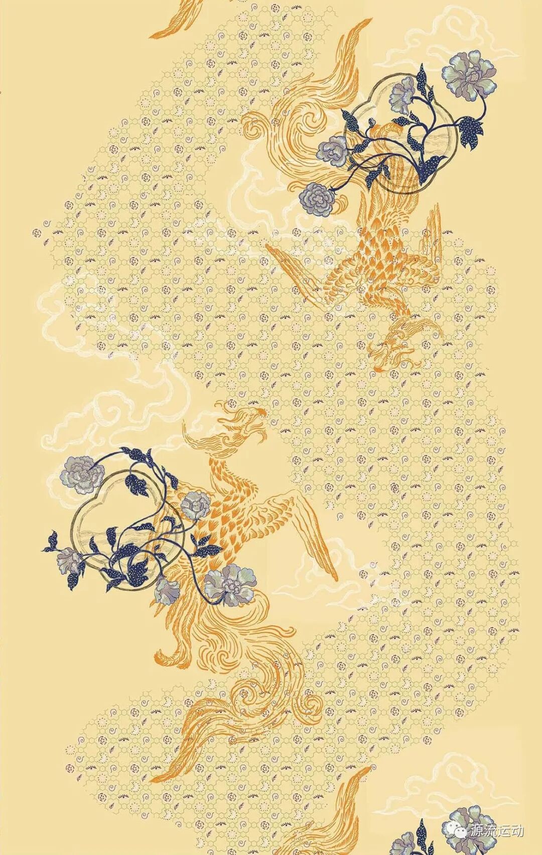 寓意吉祥的凤穿牡丹,通常设色饱和度高,追求整体上的视觉冲击效果。而本作品试图另辟蹊径,探索一种融入宋风理性之美的、凤凰和水墨缠枝牡丹的凤穿牡丹图案。本设计底色令人联想到微微泛黄的纸卷,边缘追寻了宋代影青瓷的天青色。在隐现的网格上添入水墨双色牡丹,再辅以淡金色的飞凤。所有元素都取自宋代木雕、石刻、瓷器等,整体意境上不求争奇斗妍,而是力求一种恬静含蓄的隽永,一种宋词般的诗意。尝试着用被誉为“中国第一次文艺复兴”的宋风,把凤凰这种早已融入国人骨髓的文化基因,进行一番别样的诠释。