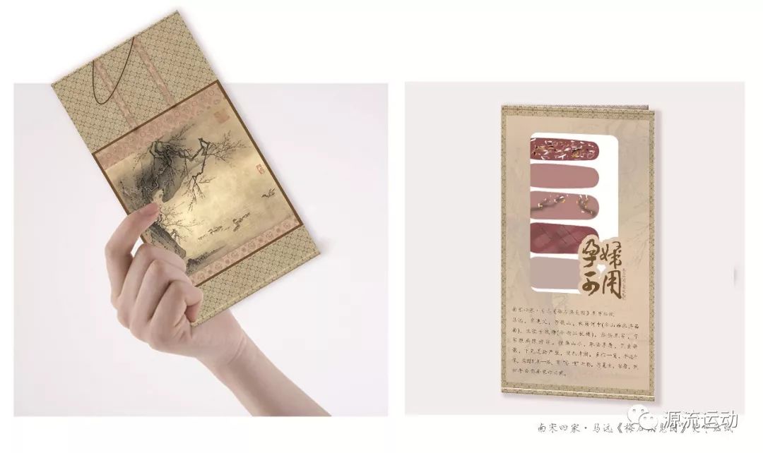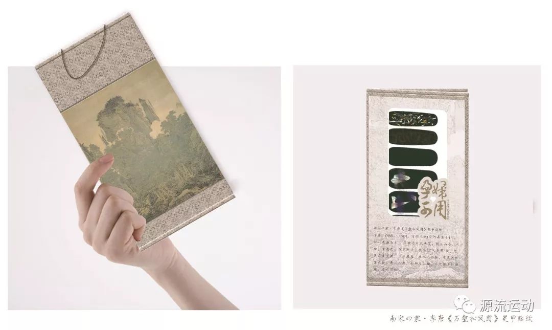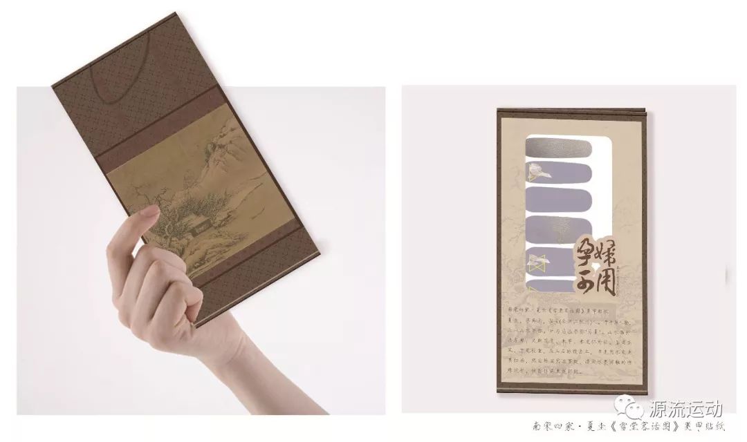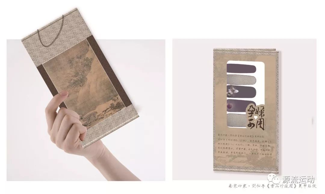 整体包装正面式样为宋代宣和装、二色裱、一色裱。天、地、绫边、隔水都采用传统宋锦纹样。宣和装的惊燕也依宋代形制而设。正面看俨然一幅缩小的宋代画作。背面有关于南宋四家的简介,每一份美甲贴纸都是参照南宋四家代表作进行的再设计,更符合当代人简约时尚的审美风格。美甲贴纸仿山石贴片为天然贝母染色,黏胶为医用级别可安心使用,贴纸尺寸小巧便于携带,经过精心测量,适合亚洲人双手,使用方便,不用时可轻松揭下,不伤指甲,保持时间可达半月。