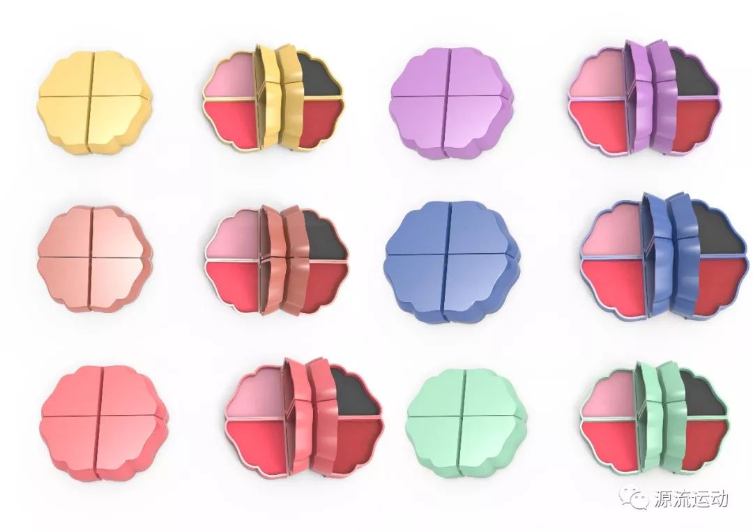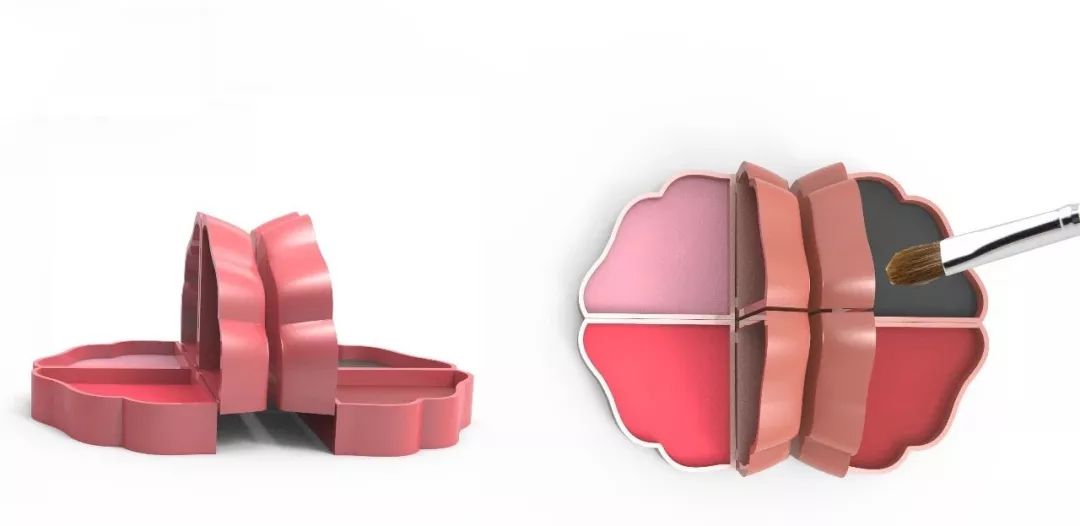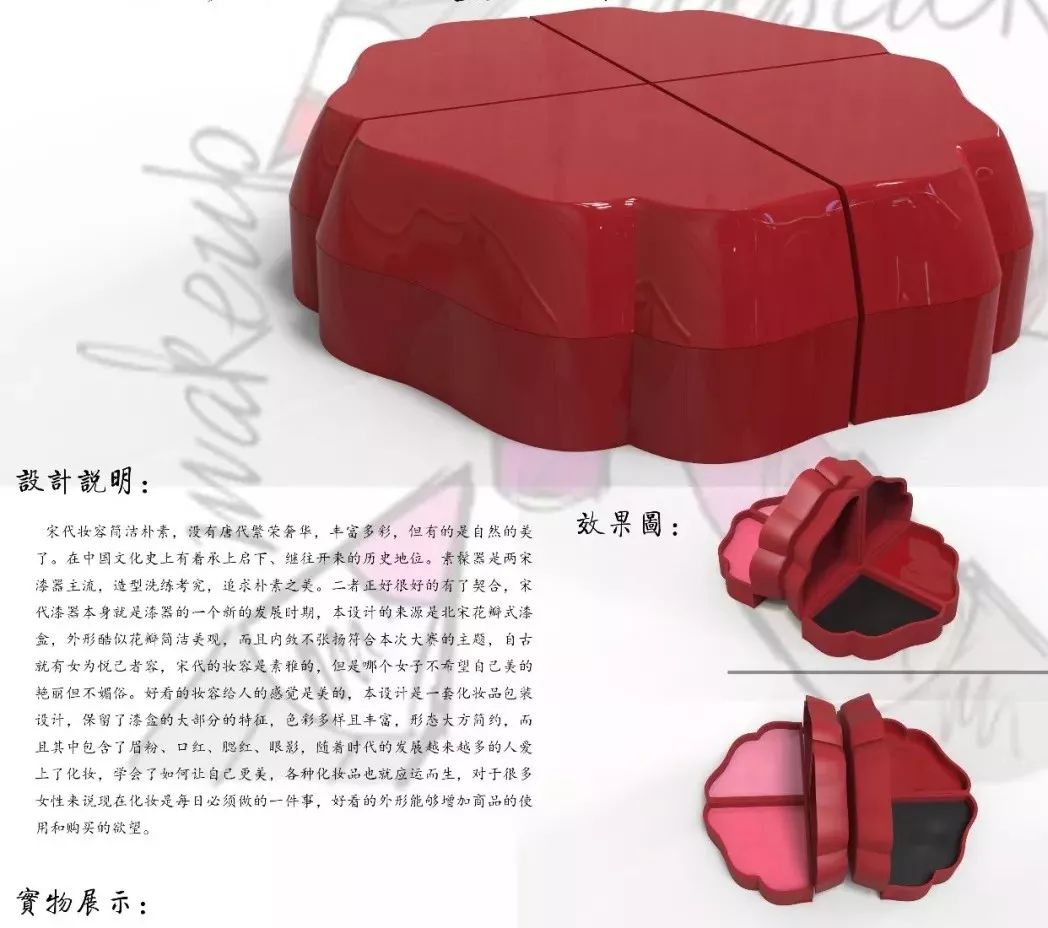 宋代妆容简洁朴素,没有唐代繁荣奢华,但有的是自然之美。素髹器是两宋漆器主流,追求朴素。本设计的来源是北宋花瓣式漆盒,外形酷似花瓣简洁美观,且内敛不张扬。内部包含眉粉、口红、腮红、眼影。